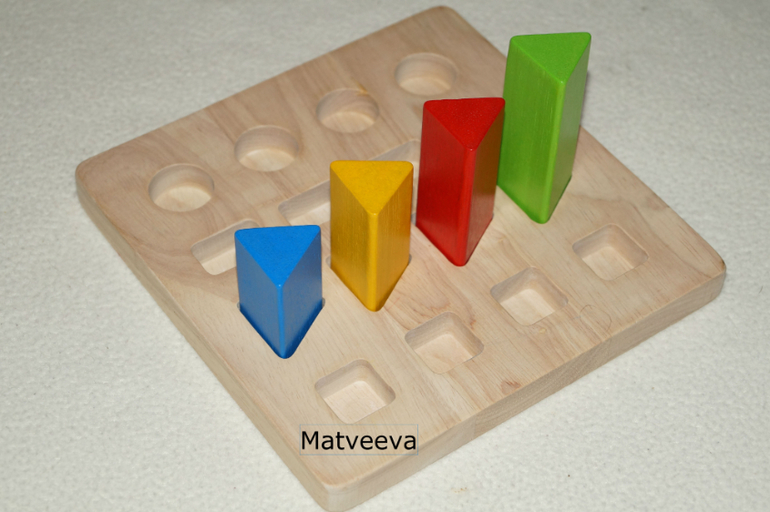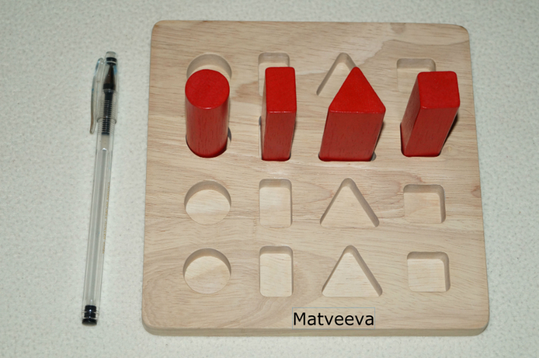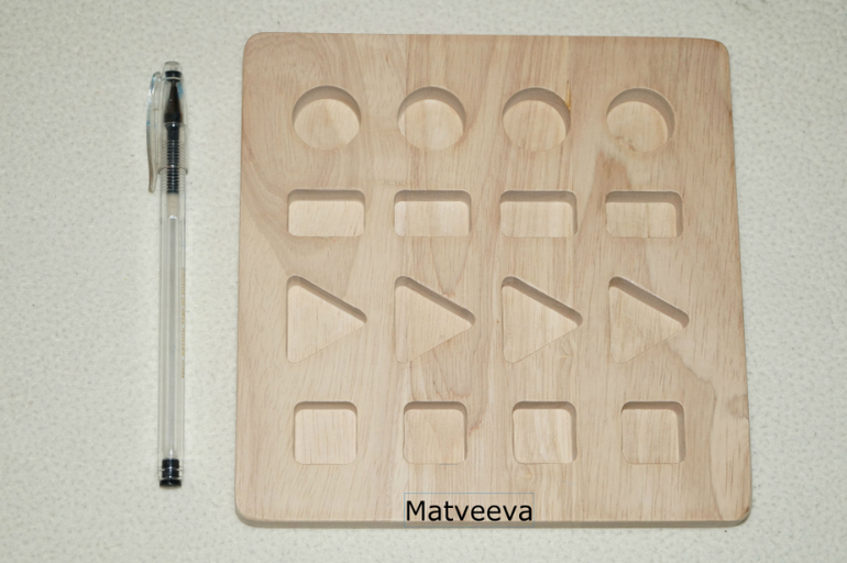 В заветной коробочке деревянный планшет с отверстиями разной формы глубиной около 1 см.