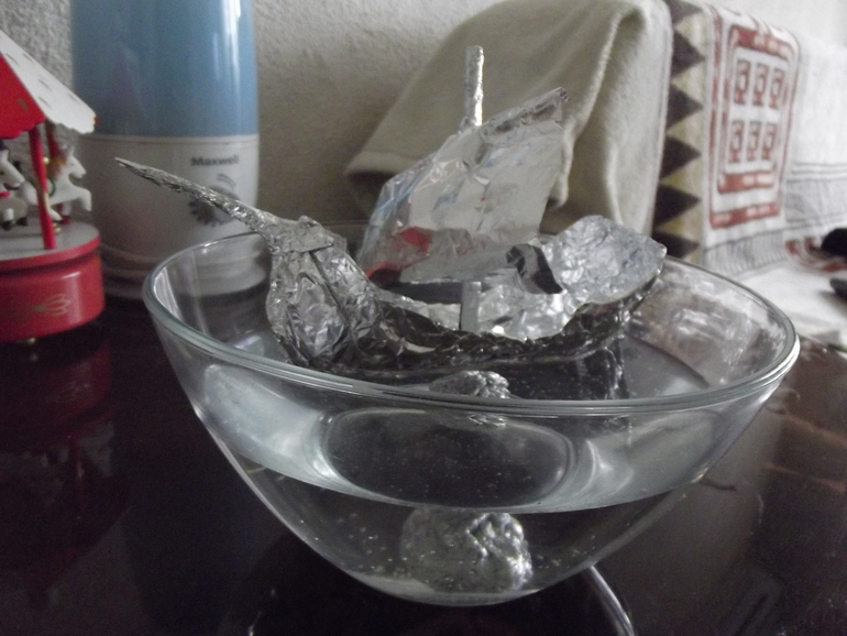 Результат: скомканный лист фольги сразу утонул, а кораблик держится на плаву.