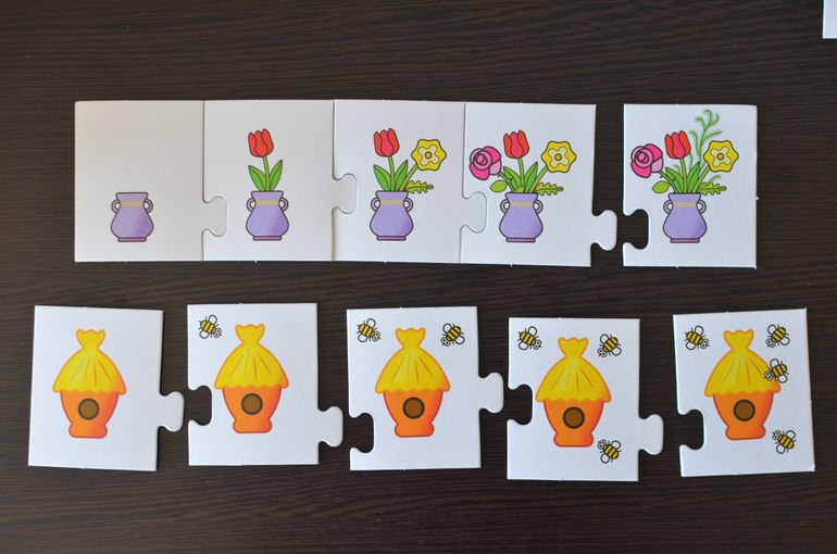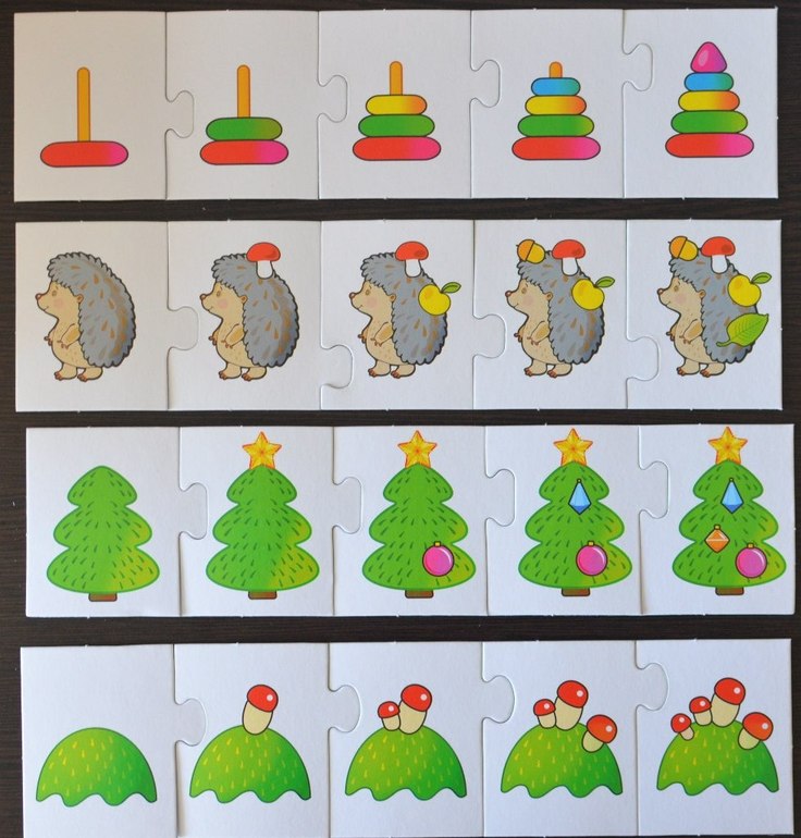 1) Раз, два, три, четыре - хорошая игра, нужно раскладывать картинки, соблюдая последовательность. Пока я сыну сама складываю, а он смотрит, все происходит в игровой форме(например, вот по лесу гуляет ежик, встретил он гриб, решил с собой взять,...)