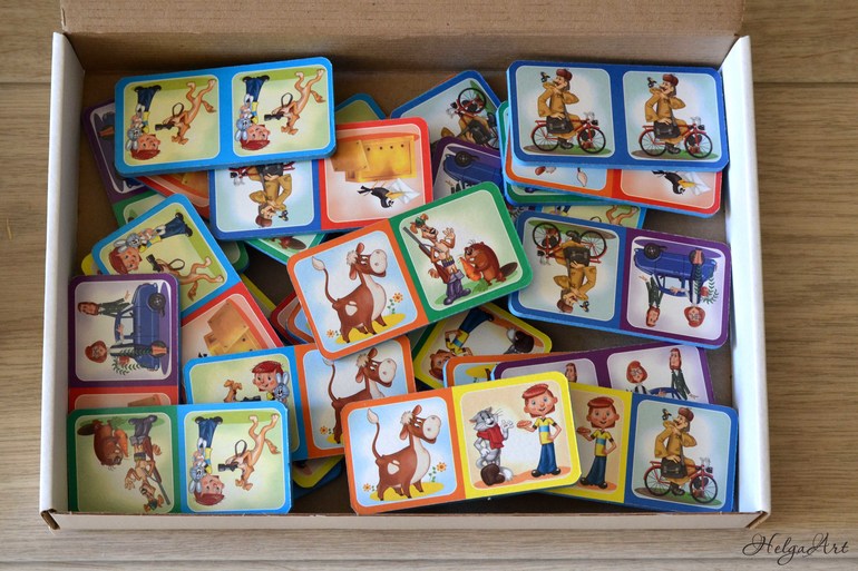 Первое домино я купила зимой в период димкиного помешательства на Простоквашино. Оно из пенки, сверху картон, такое приятное на ощупь. Но дальше рассматривания картинок и разбрасывания костяшек дело не дошло. Наверное, не дорос, подумала я и убрала его в шкаф.