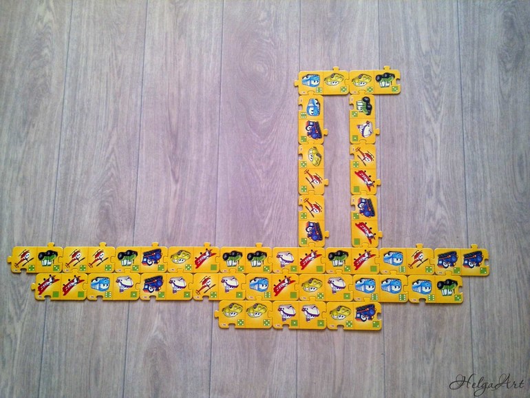 Значит, приношу я домой этот чемодан, подбегает Димка, высыпает содержимое. Я ему про "трактор к трактору" толкую, он слушать не стал, но очень оживился и погнал соединять все подряд. "Мам, кран!" - кричит. Вот это да, а сын-то придумал игру покруче домино. Оказалось, что это отличный материал для плоскостного конструирования.