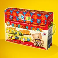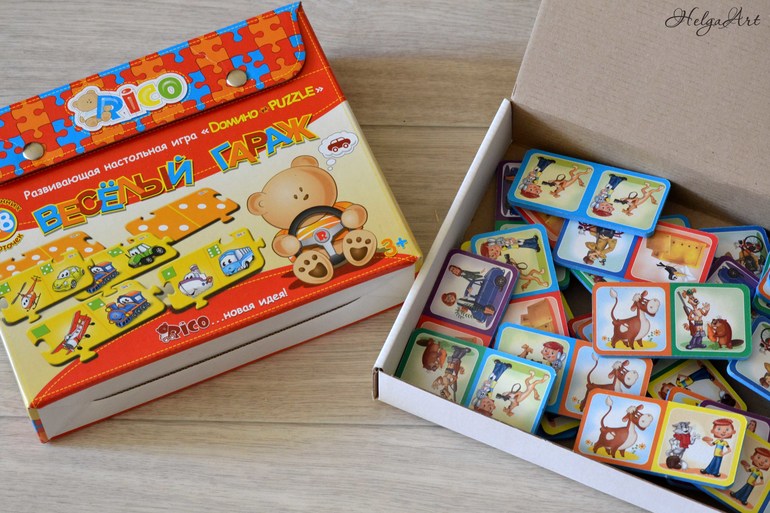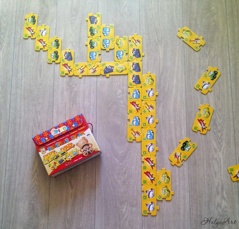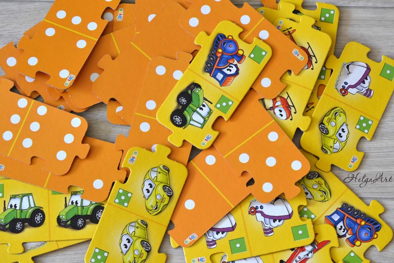 Когда на глаза мне попалось домино с пазловыми замками, я, не раздумывая, его схватила с мыслью, что для малышни так гораздо удобнее, детальки не расползаются. Доминошки из картона, крупные. Нет рядом сантиметра, но примерно 12 на 6 см. И большой плюс, что они двустронние - с картинками и классика с точками. Еще понравилась упаковка - чемоданчик на кнопках с ручкой.
