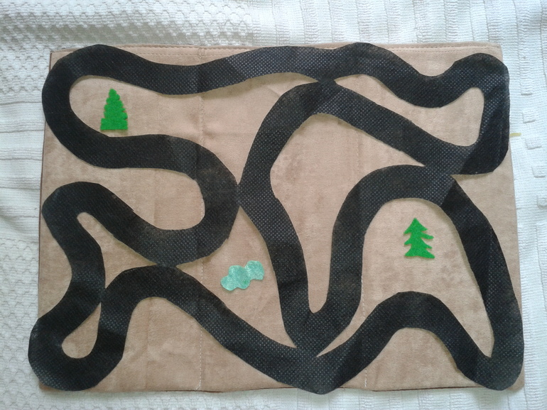 Самодельные игрушкиПланируется двухнедельный отпуск с перелетом и надоумилась сделать нечто компактное и развлекающее в дороге и в отельную сиесту. Взяла два лоскута чего-то похожего на бархат, размера А4, вшила по размеру три тоненькие картонки, чтобы можно было сложить гармошкой и в тоже время положить на колени как поднос для игр. Итак первая игруха нагло подсмотренная у БеБешечки Натальи http://m.babyblog.ru/user/NATO_85/3050539, спасибо ей за такую идею. Вторую игруху навеял наш магнитный набор, который мы с собой конечно не потащим. И наконец третью подсмотрела наблюдая за дочкой, как она водит машинками по одеялу с рисунком. Дорогу вырезала из укрывного материала и приклеила на паутинку(было бы проще, если бы была просто черная клеевая), думаю еще сделать разметку замазкой или лаком и может заламинирую какие-нибудь знаки или магазины или светофоры.