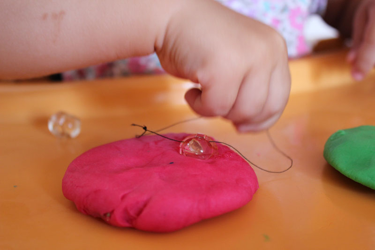 В одну из бусин продела ниточку, получился "выдергивательный" штамп. Варе понравилось впечатывать бусинку в пластилин, ловить ниточку и дергать ее. Так выдергивает,что бусинка вылетает за пределы рабочего пространства.
