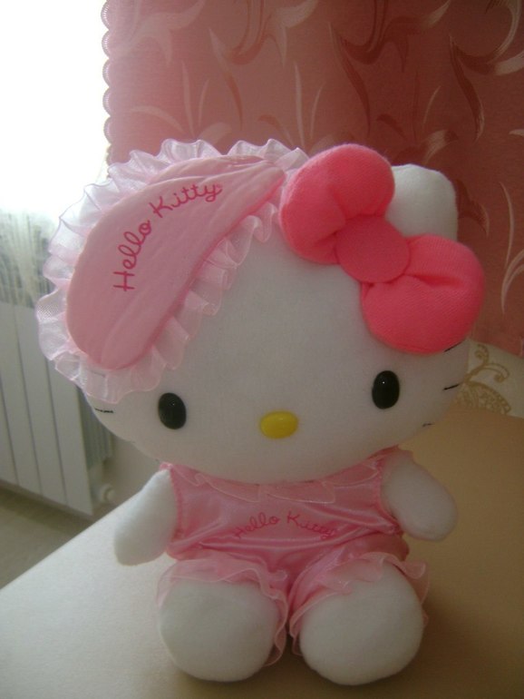 В комплекс с Китти входит сатиновая,розовая пижамка и очки для сна