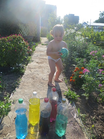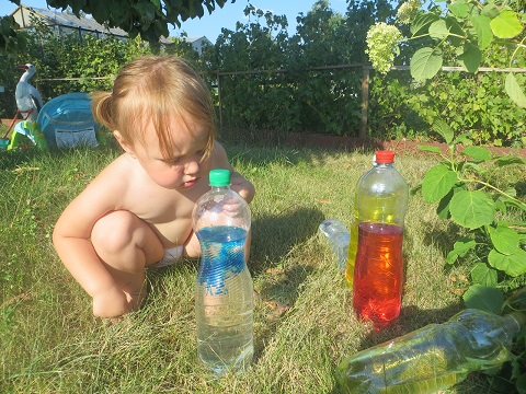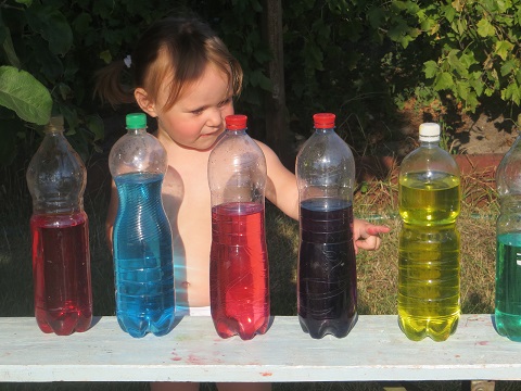 Т.к, игры с водой Яночка очень любит, одной бутылкой дело не закончилось. Вообщем, наполнили все имеющиеся бутылки. Потом решили водичку подкрасить. Я использовала пищевой краситель. Можно и гуашью, но вода получается непрозрачная. И еще оказалось очень интересно наблюдать за тем, как растворяется краситель.