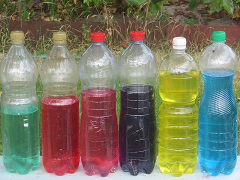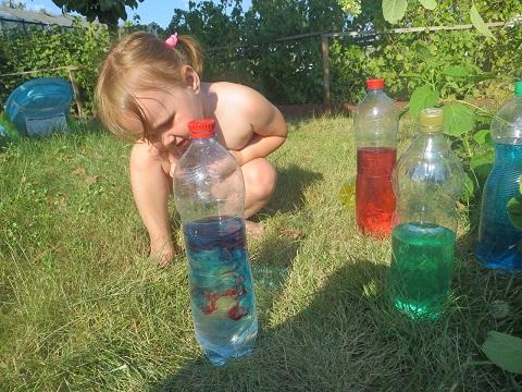 Вот такие яркие бутылочки у нас получились. Это мы их еще и по высоте воды выстраивали.