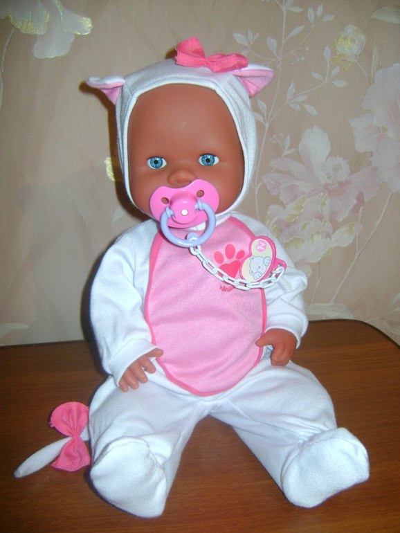 Пупсик имеет размер Беби -Бона около 45см,одет в красивый белый костюм с ушками