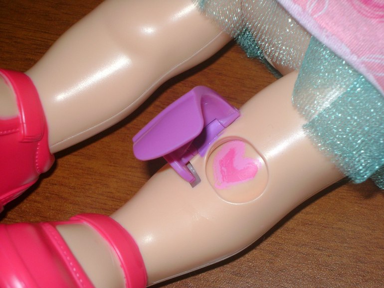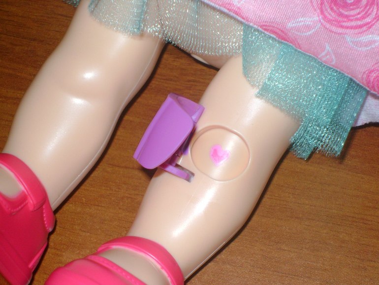 Под лейкопластырем на ножке у куклы появилась ранка в форме сердечка-мажем волшебной мазью и ранка уменьшается "на глазах" и исчезает)Куклу можно поить водой и она будет писать