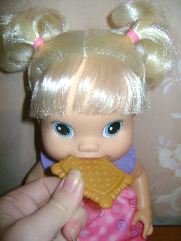 Стоит только дать кукле откусить печенье(у печеньки отходит уголок-создается имитация будто кукла откусила кусочек по настоящему) и зубки вырастают
