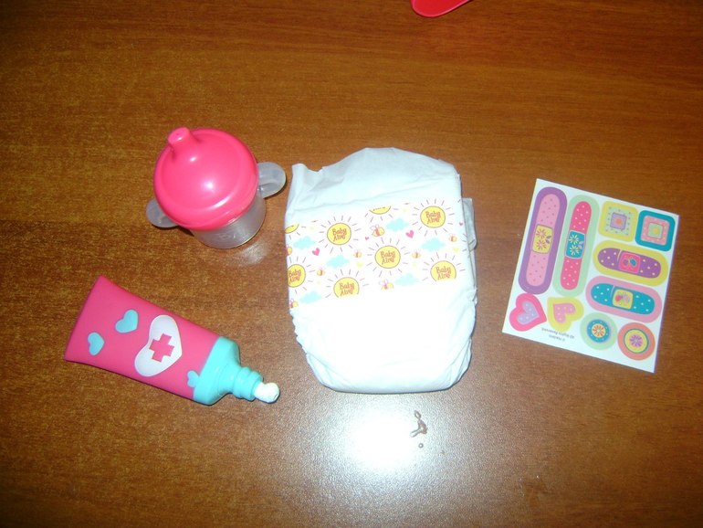 В комплект с куклой входит мазь,разноцветные лейкопластыри,подгузник и поильник