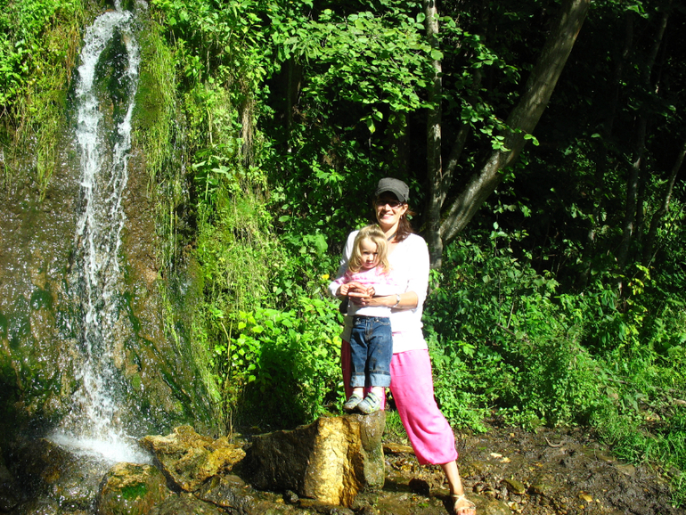 Суббота. Водопад Радужный находится на Калужском шоссе, где то уже в самом конце московской области (или в начале Калужской… я не поняла))) … Мы ехали км 100 от дома. Чуть-чуть проехали этот неприметный поворот, вернулись и все сразу нашли))) Место это ни где ни кем не обозначено и поэтому все друг у друга спрашивают «А как пройти на водопад?»))) А многие про него ничего и не слышали, а просто приехали навестить детей в лагерь))) Место для Подмосковья интересное. Муж у меня остался в диком восторге, я просто в восторге)))) Очень красивые места!!! Мы думали, что мы одни с таким малышом туда приехали, а оказалось, что там половина с такими же детьми, а остальные с детьми постарше)))) Короче, все кто встречался нам в пути были с детьми)))) от одного месяца и старше))))) кто-то был и как мы, с коляской… Как оказалось, через лес вообще очень трудно спуститься, а в обход, через поле можно… Даже с коляской (несмотря на оооочень крутой спуск), а вот к самому водопаду с коляской не попадешь… Будешь нести ее на себе)))) Оставив папу с Володькой у леса, мы с Катюхой пошли к водопаду… Дорога оказалась не из легких… Но было очень весело)))) падали, спотыкались, но шли)))) Очень много ручьев, грязи, бревен и всего, что мешало нам идти… Я была в простых босоножках и мысленно с ними попрощалась… Но ничего… На обратном пути они отмылись и стали как новенькие… Чего не скажешь о ногах… Их я еще долго отмывала дома… Кроссовки в данном случае - вещь хорошая, но промокаемая))) Короче, было оооочень мокро и скользко… А еще - вода по дороге к водопаду просто ледяная!!! В итоге, до водопада мы добрались, попили, умылись и пошли на выход… Пока гуляла на полянке с детьми, муж тоже дошел до водопада. В итоге, мне все очень понравилось! НООО… там столько ос…. Хотя говорят из-за жары их везде много… Прям очень много… Я все боялась, чтобы детей не покусали… Тьфу-тьфу-тьфу, обошлось…