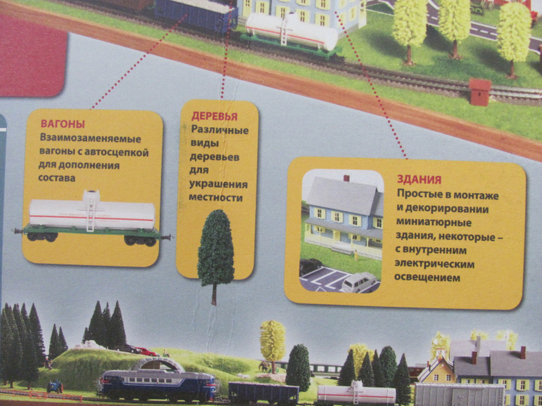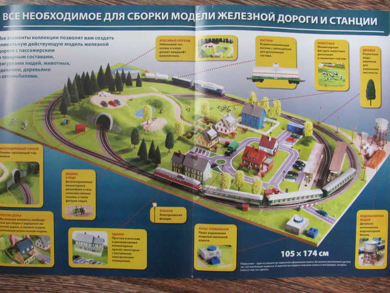Обещают целый город с фигурками людей, деревьев, домиков, паровозики. Сам тепловоз нужно будет отдельно покупать.
