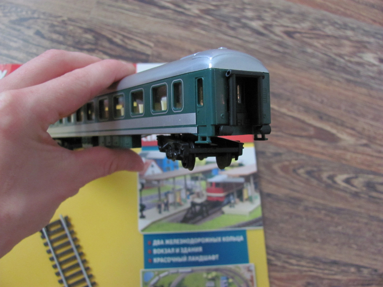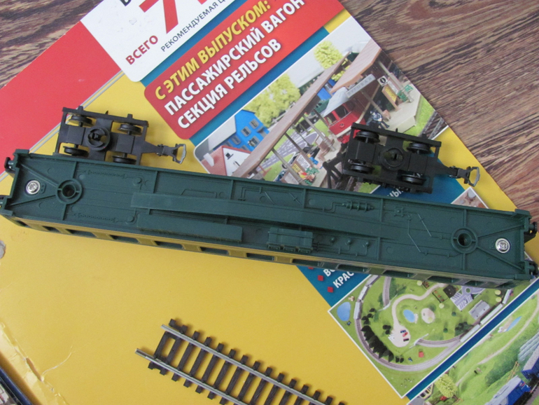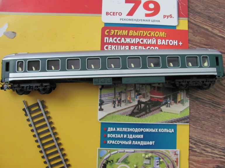 В набор с журналом входит Вагон + прямой участок колеи. . Рельсы - 24 см, вагон - около 25 см (плюс механизм сцепления), высота 5 см, ширина 3,5 см. Вагон хорошего качества - пластмасса (двери не открываются -сын проверял)), снимаются колеса.