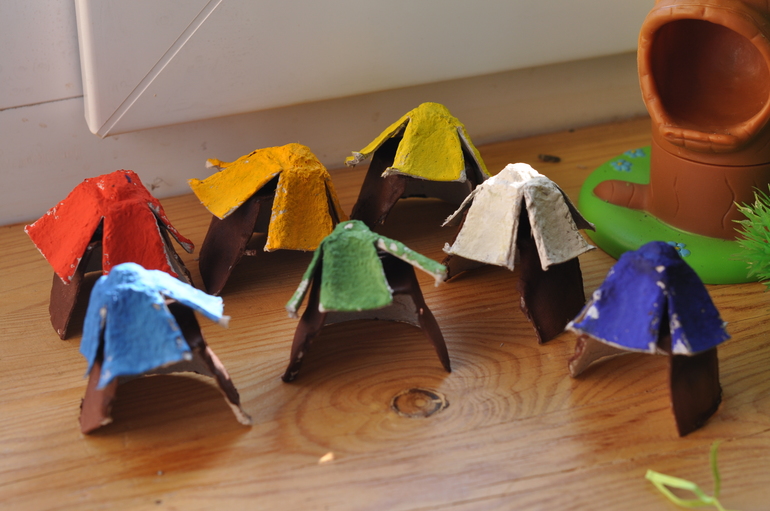 И пошли делать домики для смурфиков, которые будут жить в волшебном лесу. Взяли лоточки из-под яиц, покрасили их в разные цвета и получились милые избушки: