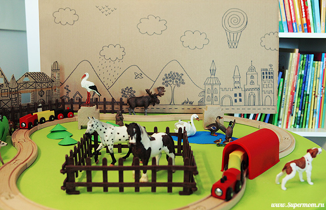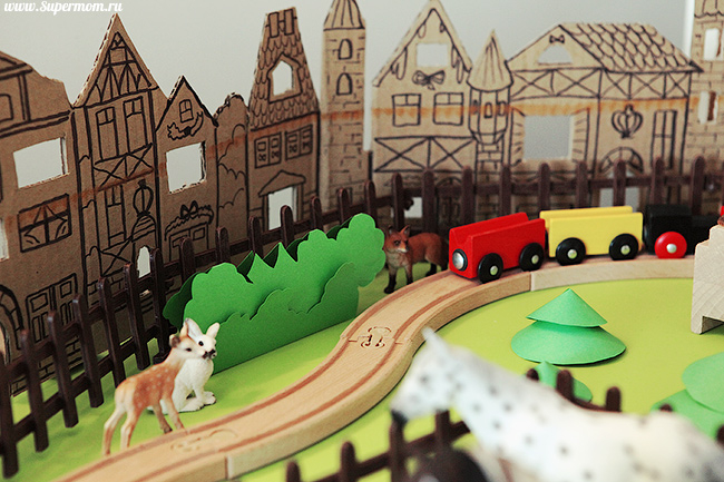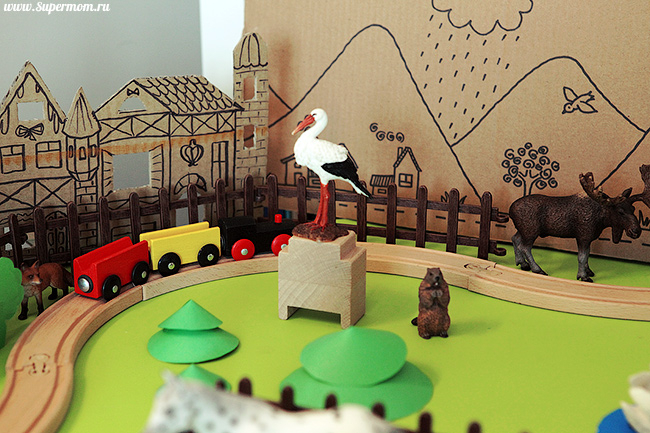 Конечно, через 10 минут город полностью меняет свой облик. На рельсах пасутся слоны, животных из загона выпускают на вольные хлеба, на водопой приезжают плюшевые медведи на грузовиках, коров непременно надо накормить морковкой из пластилина, а поезд катает исключительно лесных зверей, но ведь это совсем не важно)