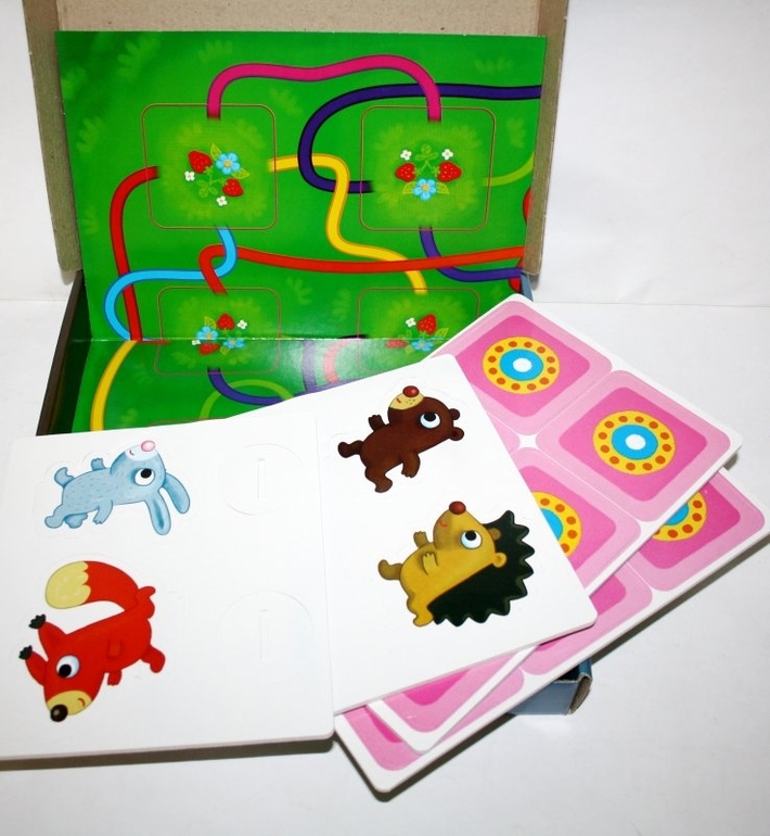 На игровом поле изображен простейший лабиринт из перепутанных разноцветных тропинок, соединяющих лесные полянки. На каждой полянке игроков ждут встречи со зверями и птицами: бобром, кротом, кабаном, лосем, оленем, мышкой, лисой и совой, которые готовы подсказать заплутавшим малышам дорогу. Про каждого героя взрослый может прочитать малышам веселый стишок, написанный на карточке рядом с картинкой. Чтобы победить в игре, участнику нужно как можно скорее найти на поле маму своего персонажа: бельчиху, ежиху, зайчиху или медведицу. Это милая добрая история со всегда счастливым концом!