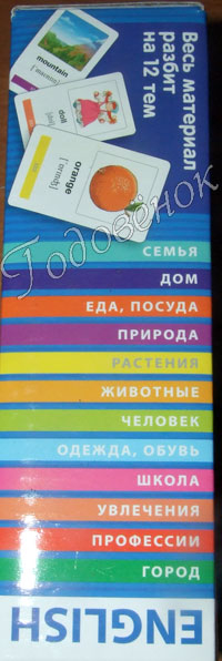 Всего в наборе 333 карточки по 12 тематикам: семья, дом, еда(в т.ч. посуда), природа, растения, животные, человек, одежда и обувь, школа, увлечения, профессии, город.