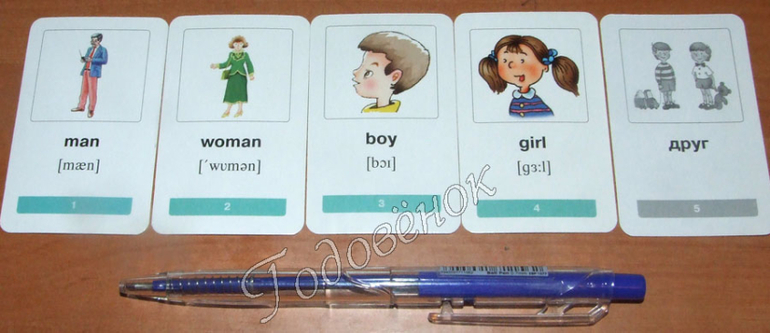 На лицевой стороне карточки картинка, слово на английском и транскрипция. На обороте этаже картинка, только черно-белая и слово на русском (на фото 4 карочки лежат лицевой стороной вверх, и последняя, пятая - оборотной)