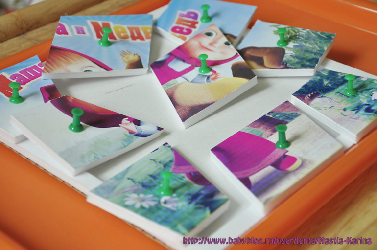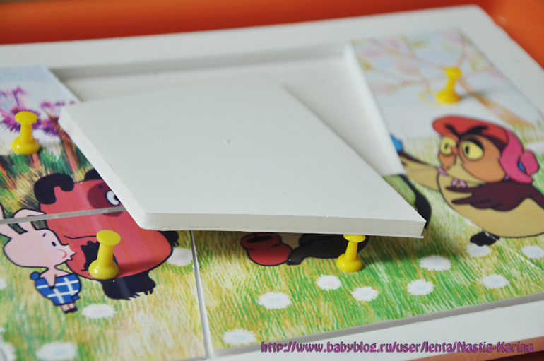 Выбрала из интернета картинки ( любит дочка Машу и Винни Пуха), напечатала на дом принтере (картридж заканчивался, печать не очень яркая вышла), вырезала кусок пенокарнона ( по размеру картинки + 1-1,5см с каждой из сторон), из этого квадрата пенокартона вырезала прям по размеру картинки серединку. Приклеила картинку к пенокартону. Надо дать хорошо просохнуть клею, а то нож будет рвать фотобумагу!