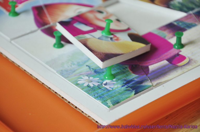 Вырезала картинку на части. Отрезала плоскогубцами острые кончики кнопок, воткнула посреди каждой части, смазав клеем Кристал Момент. С нижней стороны приклеила простой неокрашенный картон.