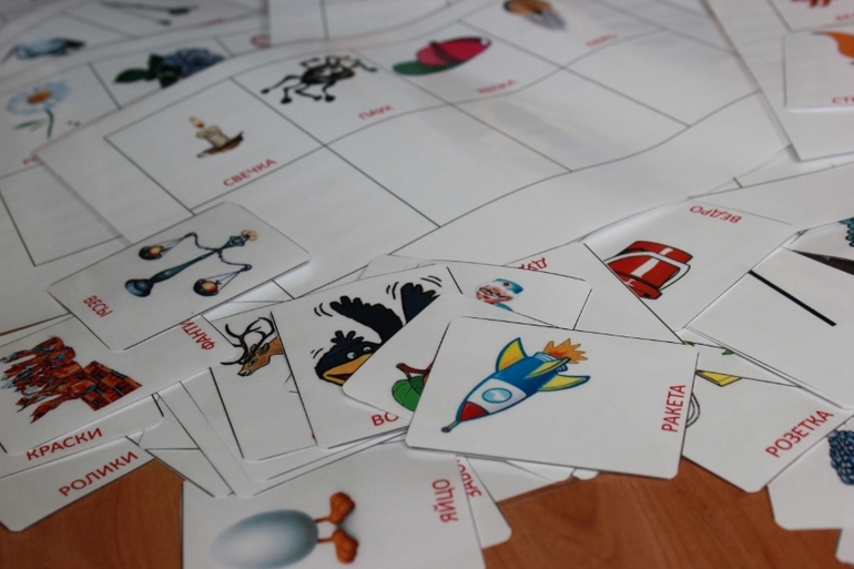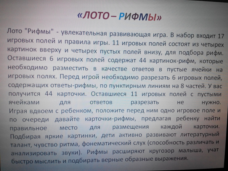 Сделалось вот такое лото, на мой взгляд очень интересное и полезное. Похожая игра есть в продаже, но с меньшим количеством рифм.