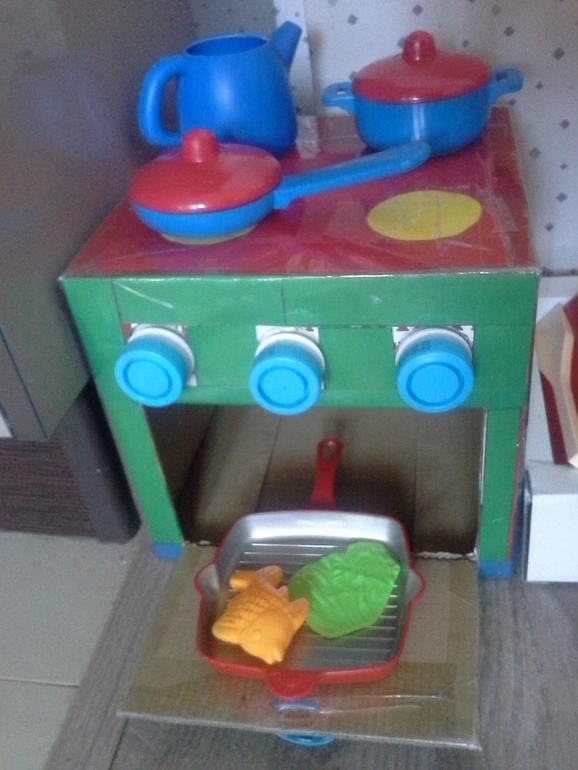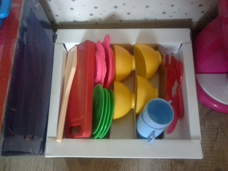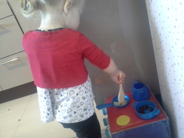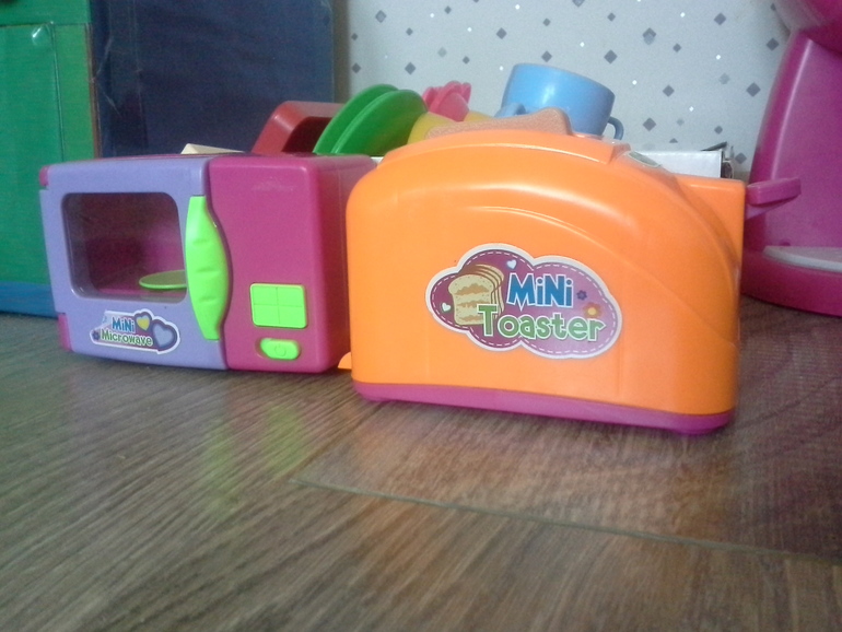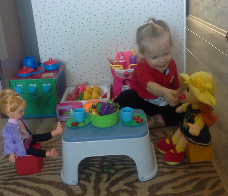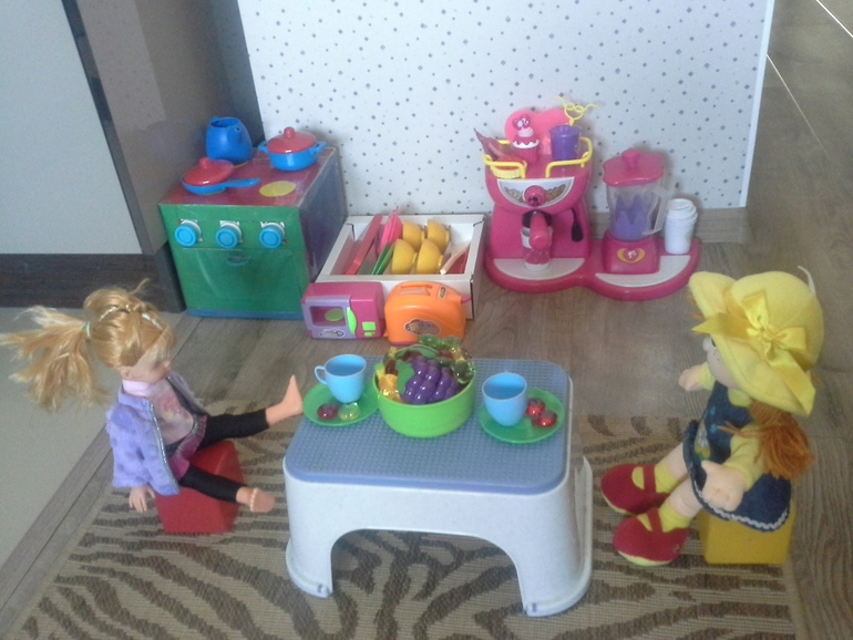 Всё началось с того, что папа сделал нам игрушечную плиту, потом нам подарили кофе-машину и блендер, потом мы купили игрушечную посудку, потом мы купили тостер и микроволновку…в общем было еще несколько «потом»… и у Ульяны появилась настоящая кухня!