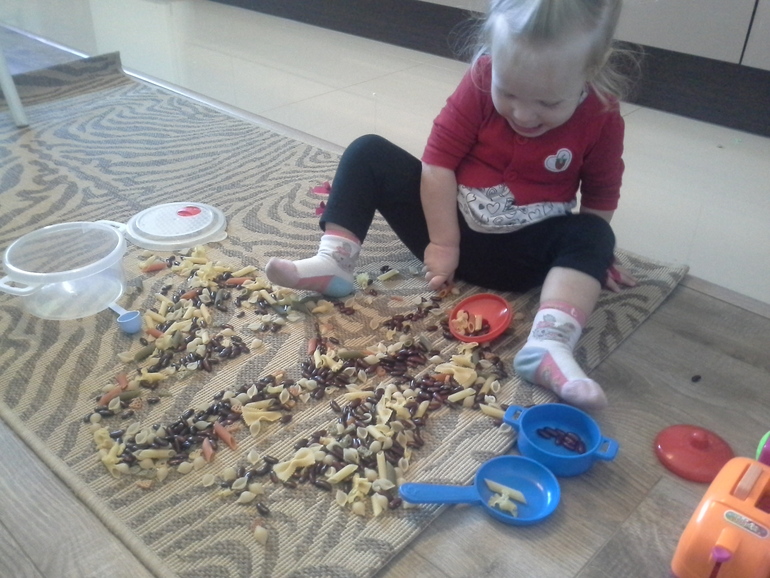 Ингредиенты в виде перемешанной фасоли с макаронами были нещадно высыпаны на пол. И началась сортировка: для фасолевого супа в кастрюлю отправлялась фасоль. На второе в сковороду складывались макароны.