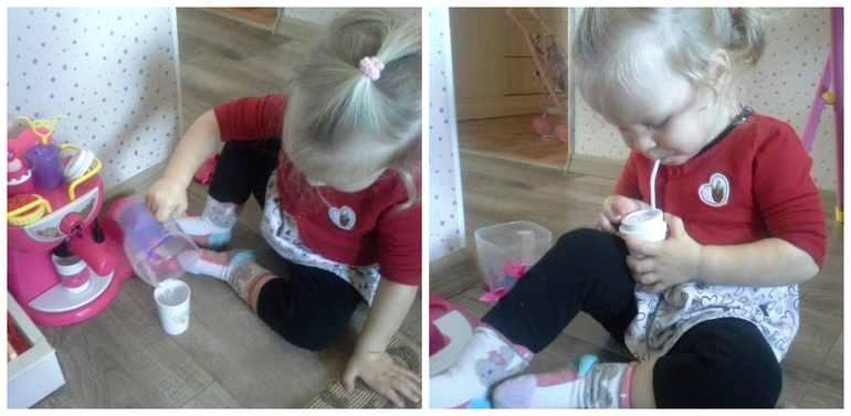 Наливаем себе в чашечку, закрываем крышечкой, вставляем трубочку - пьём.