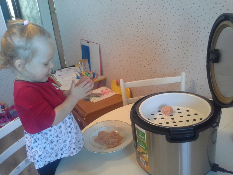 Разумеется, Ульяна всегда с удовольствием подключается к реальному процессу готовки. Вот я приготовила фарш, а лепить котлетки - это уж дело Ульяны)