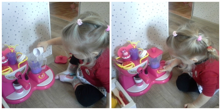 Мама попросила чашечку кофе. Не проблема! У Ульяны кофе-машина с капуччинатором имеется. А себе Ульяна сделает витаминный коктейль. Правда, здесь сегодня почему-то из ингредиентов только вода. А процесс самый настоящий! Заливаем воду в блендер. Нажимам на кнопочку - блендер крутится и жужжит.