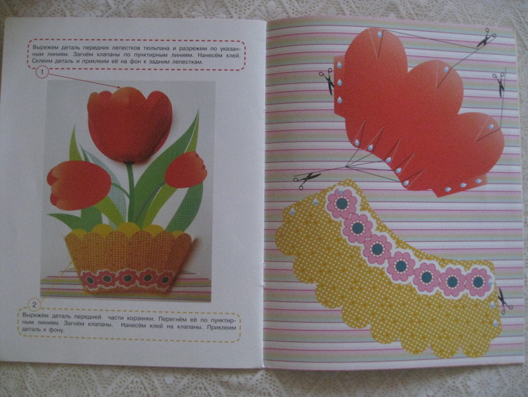 Цена вполне скромная, качество отменное: мелованная бумага, яркие рисунки. В каждом альбоме 4 аппликации, с обратной стороны листа -"основания" инструкция. Мой ребенок 5.5 лет не очень хорошо справляется с вырезанием, но клеит куда и как надо. Покупала штук 6-7 разных альбомов, раздарили братьям-сестрам-подружкам, оставили себе парочку. Несколько дней назад поняла, что некоторые из предлагаемых аппликаций вполне подойдут в качестве подарка любимым воспитателям к предстоящему празднику, если аккуратно всё сделать и оформить в рамочку или наклеить на плотный картон.