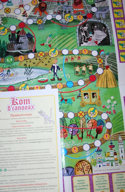 Динамичная ходилка с большим количеством голубых и красных клеток, которые делают каждый ход игрока непредсказуемым. Так же не дают скучать карточки-сюрпризы, как с позитивными, так и с негативными заданиями. Но больше всего понравилось поле - подробная иллюстрация сказки, мы даже, наигравшись с фишками, пустились в пересказ и поиск персонажей истории о Коте в сапогах. Думаю, такая игрушка будет интересна деткам лет с двух-трех.