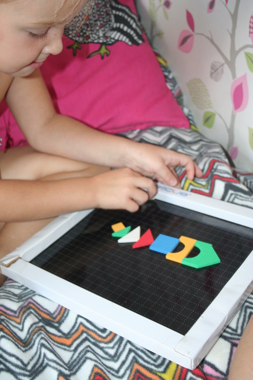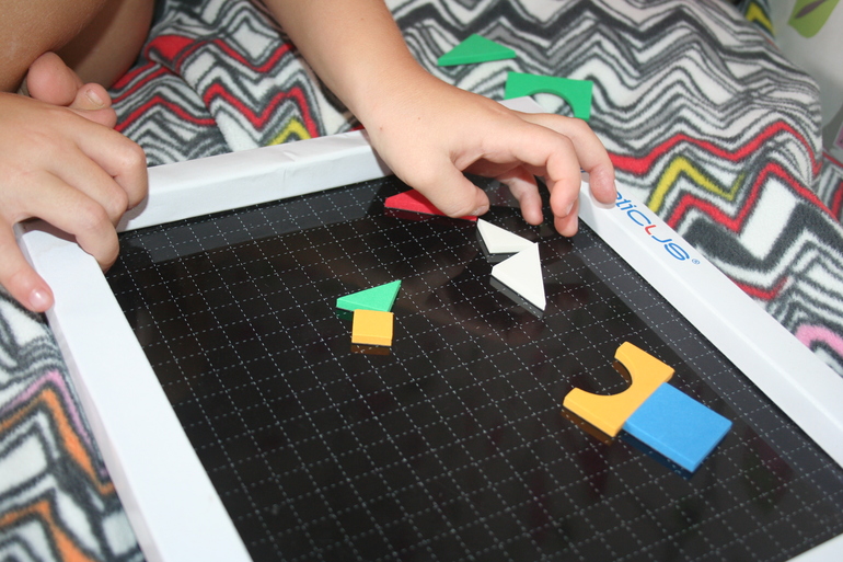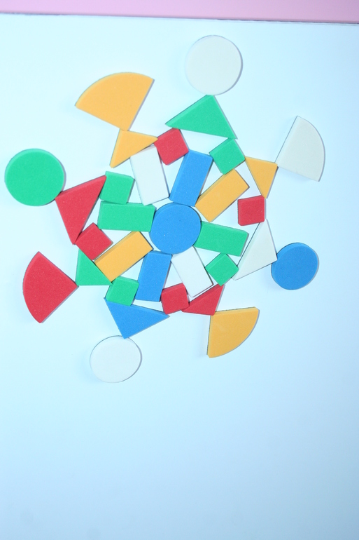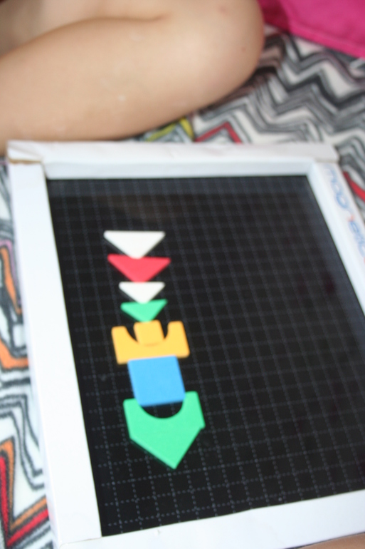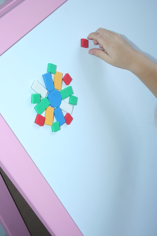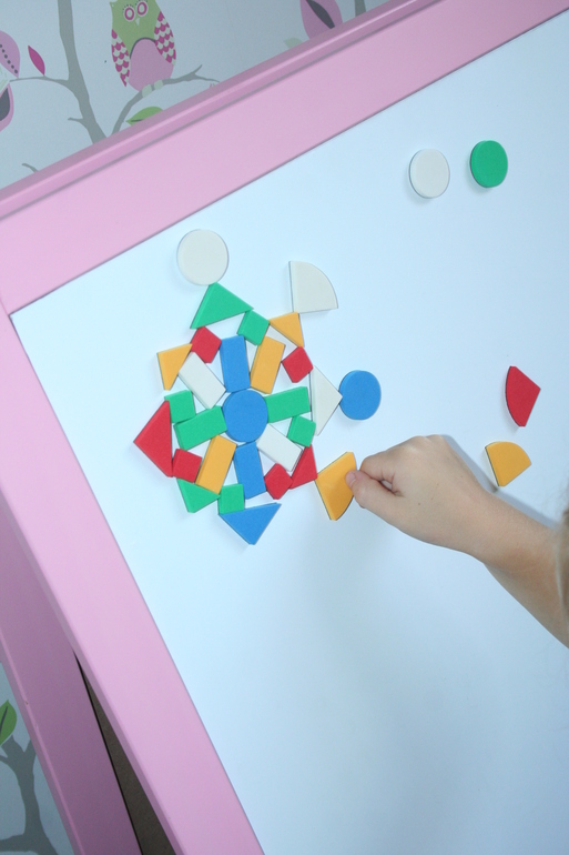 Еще на большой доске мы выкладываем мандалы. Очень увлекательное это занятие и может длится очень долго :-) Мы используем как чередование цветов, так и форм, а иногда и того и другого сразу. Обычно я выдаю Камилле кусочки для создания рисунка, но иногда она ищет нужные части и в общей массе.
