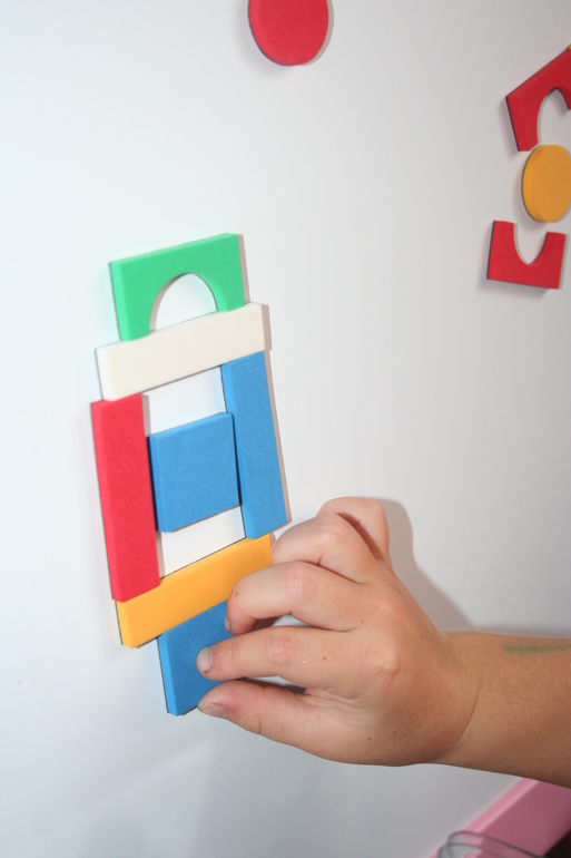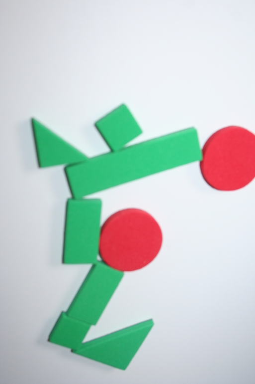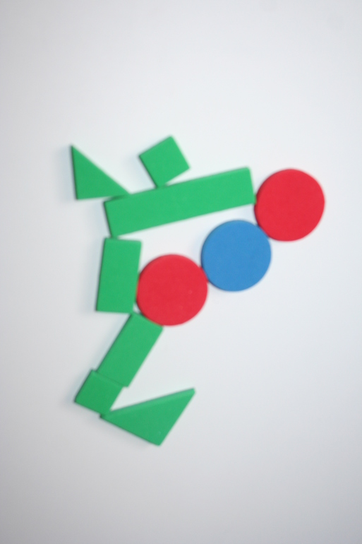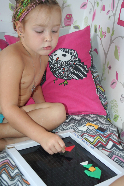 Детали для копирования отбираются заранее, чтобы не усложнять поиск и не затягивать игру. Кстати, еще один вариант игры: из одних и тех же фигурок создавать все новые и новые придумки. Например из одного длинного прямоугольника, двух треугольников и двух кругов можно сделать собаку, муху, поезд, качели и т.д. Мы очень любим так играть, потому что обожаем удивляться и удивлять :-)