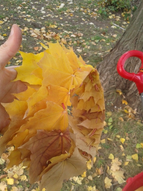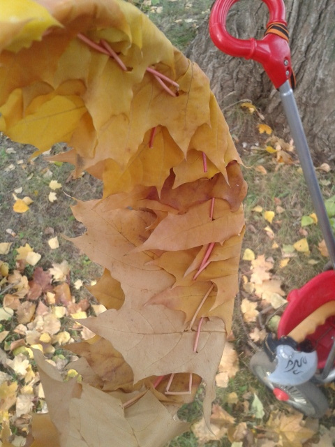 Сначала складываем три кленовых листа пополам, друг в друга полоской; а затем другими протыкаем и соединяем их в одну ленту. Черешок листика лучше отрывать, а дырочки аккуратно делать тоненькой веточкой
