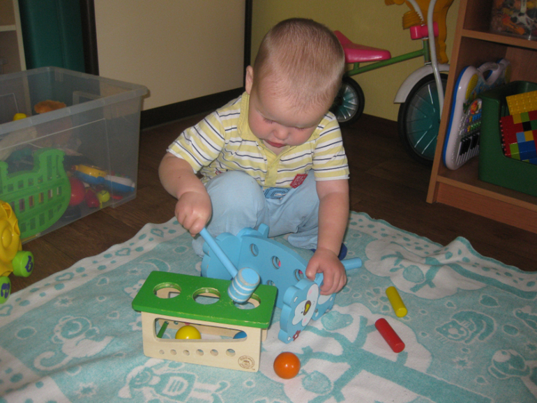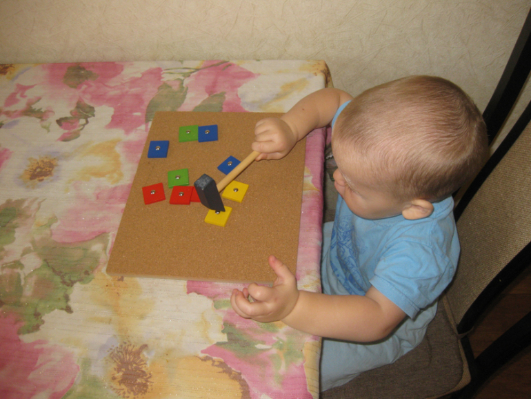 В 1 г. 8 мес. младший сын вытребовал себе молоток и гвозди (вот что значит наличие старшего брата). В рот ребёнок уже ничего не тащит, но всё равно строго под присмотром!!!. Очень понравилось ему забивать гвоздики, даже пытался сам их вставлять в отверстия в деталях. Старший, конечно, уже выкладывает разные композиции, а младший просто колотит в своё удовольствие.