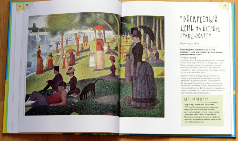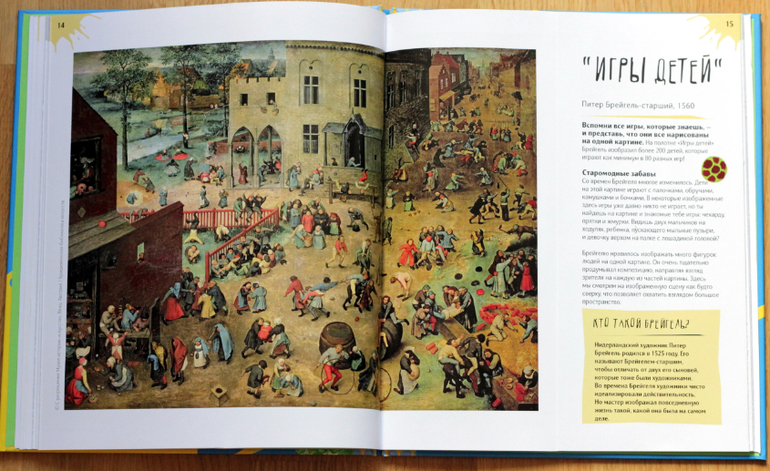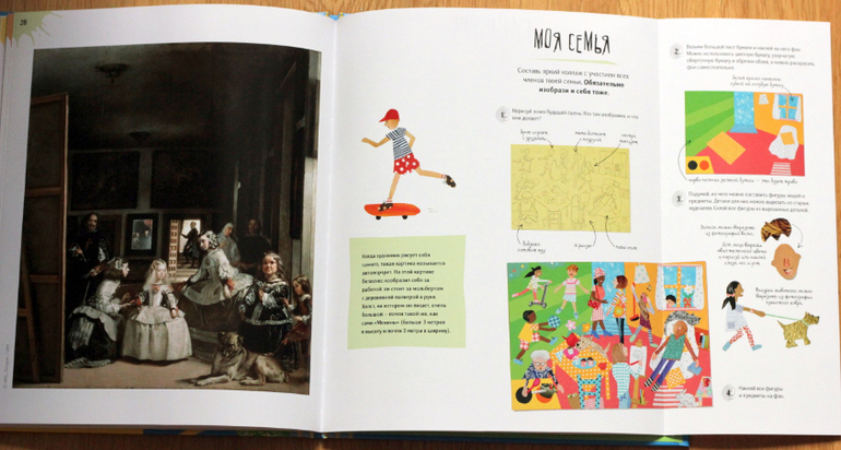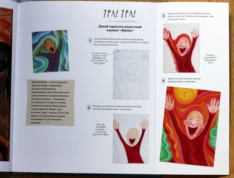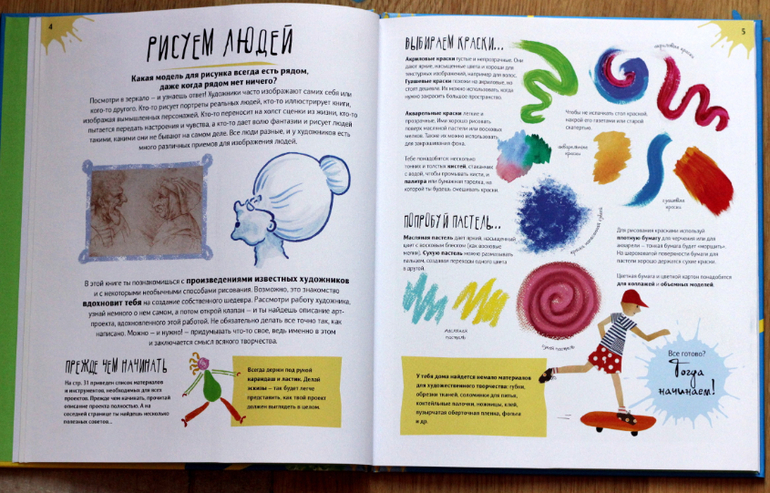 Художка ( красим, рисуем , придумываем новые способы рисовать)Эту книгу не назовёшь энциклопедией по искусству - слишком разрозненные сведения, хотя хорошего качества репродукции и маленькие, но интересные справки об авторах сближают её с этим жанром. Учебник по рисованию? Ну, здесь есть список материалов и инструментов, рассказ об особенностях разных типов красок, классные идеи для творчества, небольшой словарь художественных терминов и цветовой круг. Но, опять же, не хватает систематичности. За что же книга попала на мою полку? За то, что я больше всего ценю в познавательных детских книгах - пробуждение любопытства, возникающее желание узнать побольше о картинах и художниках, желание творить и находить смыслы в искусстве. "Иногда на картине изображено больше, чем кажется на первый взгляд - и чтобы это заметить, нужно смотреть очень внимательно", - эта фраза для меня ключевая.