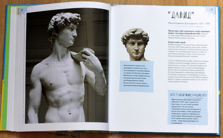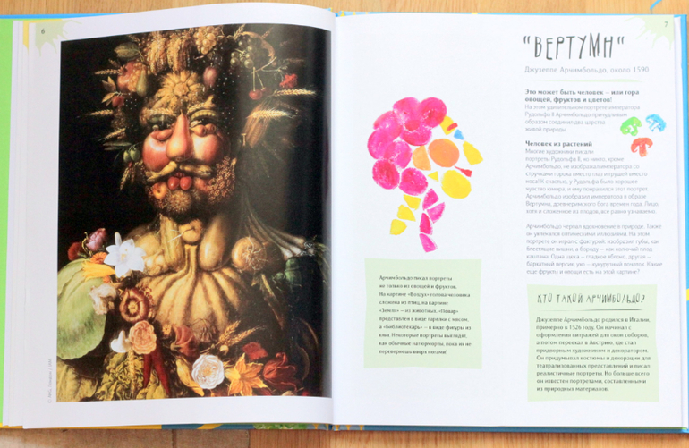 Книга немного больше формата А4, мелованные страницы. Слева представлена репродукция, а справа - информация о картине и художнике и вопросы и размышления о картине. Страница сложена пополам, внутри - идея для рисунка или поделки по мотивам картины.