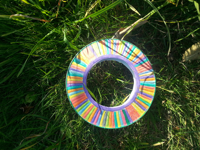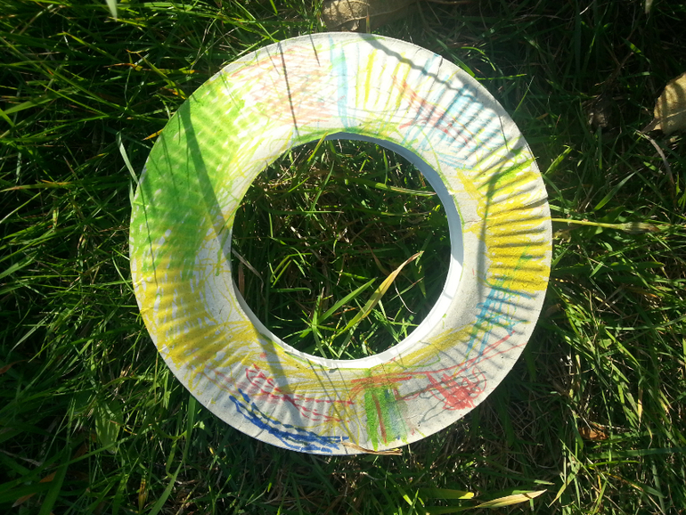 Понадобятся 2 бумажные одноразовые тарелки, карандаши/фломастеры и клей.Сначала раскрашиваем (у нас каждый свою тарелку))), серединку не трогаем, так как ее потом надо будет вырезать, вырезаем, складываем 2 тарелки и склеиваем края. Все!!!!) Можно развлекаться!