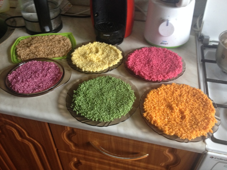 Я разделила рис на равные 6 частей, на глазок. Насыпала в каждую миску немного порошка и налила совсем чуть-чуть воды. Тщательно перемешала, переложила на плоские тарелки и оставила сохнуть.