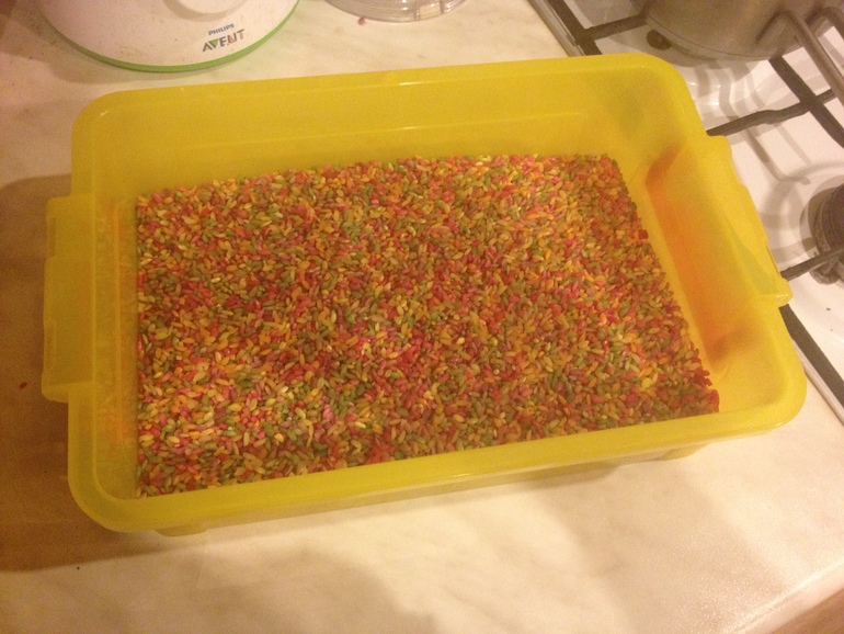 Наконец, как рис высох (примерно 6 часов), я взяла пластиковый контейнер и перемешала все части. Получилось очень эффектно, это сразу привлекло внимание сына.