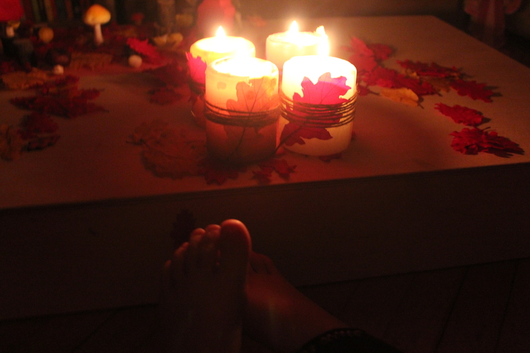 Потворив немного, мы встретили Осень и праздник начался...шелест листочков, удивительные мелодии музыкальной Оранжевой сказки, в которой у Осени есть свой собственный голос (колокола била). Мы смотрели на свечи, комнату наполняло удивительное звучание и казалось, что сама Осень уселась рядом с нами на подушки...