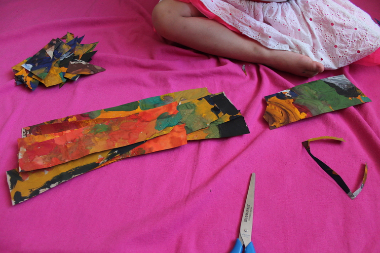 На следующий день наше пестрое полотно мы разрезали на всевозможные кусочки, чтобы создать новое творение - мозаику из всех этих частиц. Мы и по сей день над ней трудится - нелегкая это задача ))