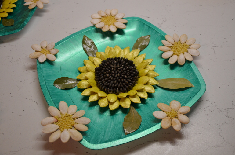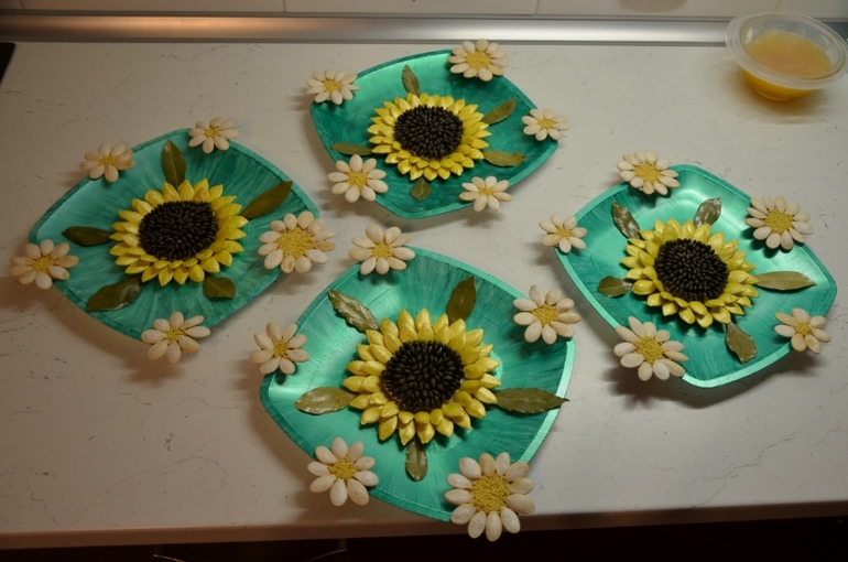 Подсолнух покрашен акриловыми красками, тарелка тоже(пластиковая). Листья - лавровый лист - покрыт лаком для ногтей. Клеили все строительным клеем пистолетом.