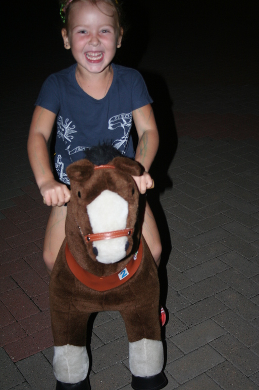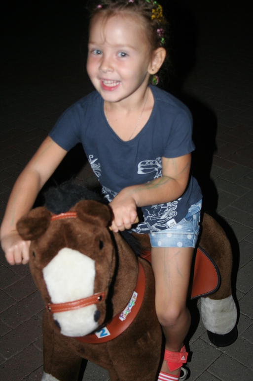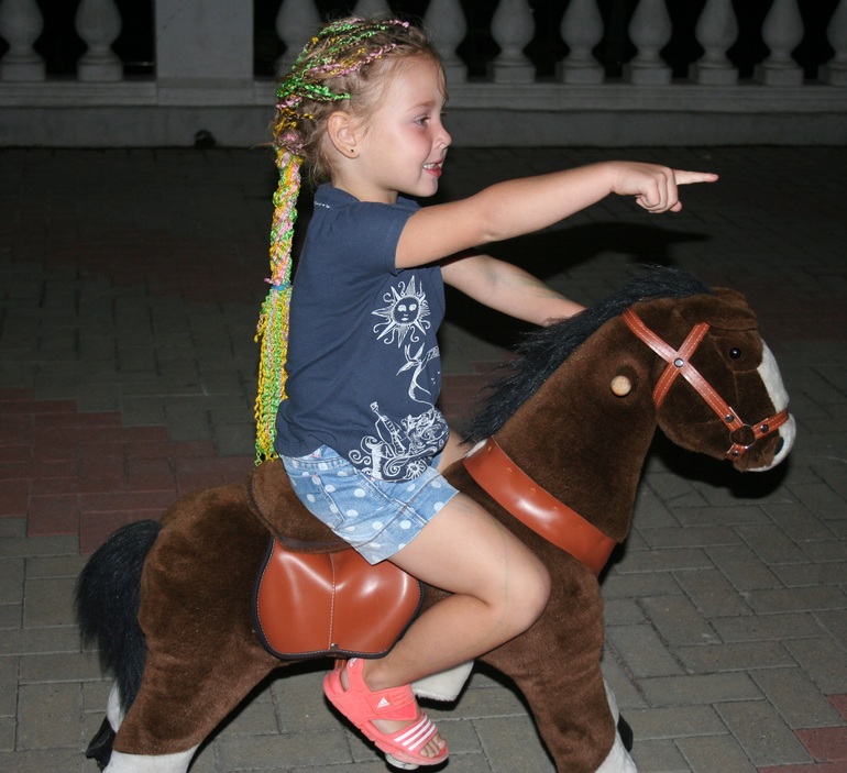 Вот, честно давно мы с мужем так не смеялись :-))) Особенно было забавно, когда дочка только осваивала новый объект, как она только на нем не прыгала, но коник почему-то почти не двигался... Но когда она поймала ритм, дело пошло на лад, и уже мы смеялись все вместе :-)
