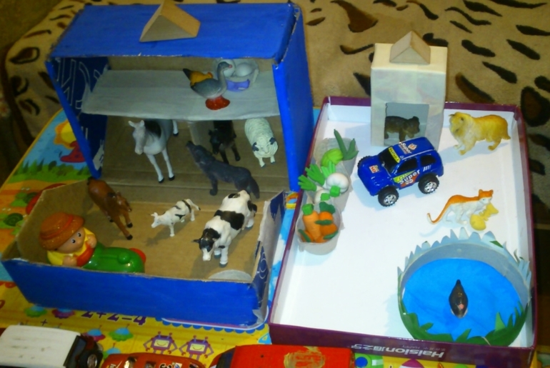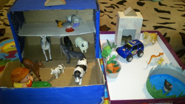 Затем, размещая всех, он не нашел места для утки. В глазах ребенка немой вопрос, а в руках мамы уже ножницы и клей... И вместе с новыми объектами новая коробка. А там уже овощи для фермера нужны - посадили экспресс-грядки.
