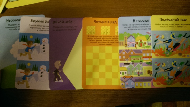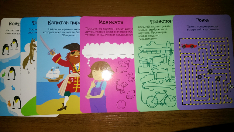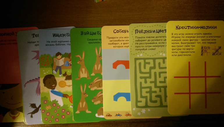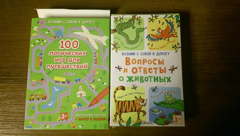 Из последних наших приобретений. Вопросы и ответы о животных и Многоразовые карточки с маркером "100 логических игр для путешествий". В этом наборе собрано большое кол-во игр и заданий-крестики-нолики,дорисуй картинку,найди отличия,лабиринты,четыре в ряд,гляделки,кроссворды,найди пропавшую букву,составь слово и многие другие. Есть задания и попроще, рассчитанные от 3-х лет,а есть и для детей постарше для 5-6 лет. Эти карточки просто находка для меня. Мой сын вообще не усидчивый,но уже 3-ий день сидит с ними и занимается,когда со мной,а иногда и один.В наборе 50 карточек,задания с обеих сторон + маркер на водной основе.