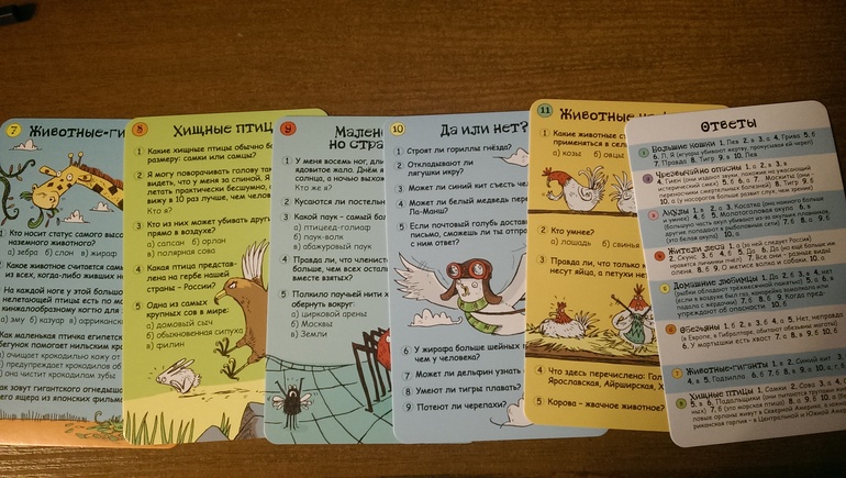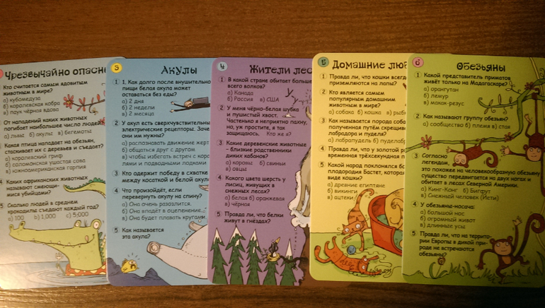 И карточки Вопросы и ответы о животных. В этом наборе вас ждут более 500 интересных вопросов и ответов о самых разных животных.Очень познавательные,я даже для себя что то новое узнала))
