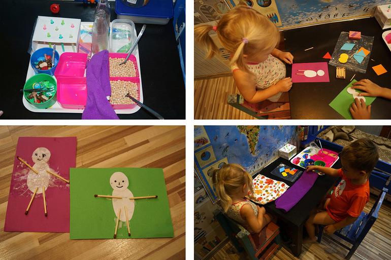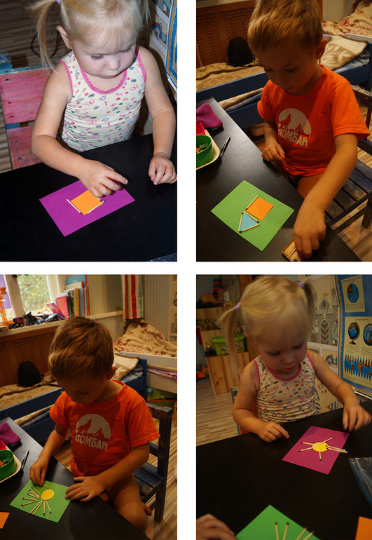 Мы из спичек складывали геометрические фигуры, солнышко, домик и человека. Человека дети попросили приклеить. На удивление сделать человечка оказалось для детей легче чем квадрат или треугольник.